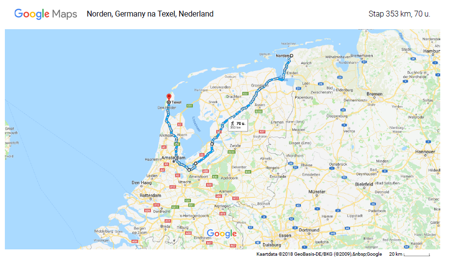 DIe afstand vanaf Norden na Texel verkry vanaf Google Maps