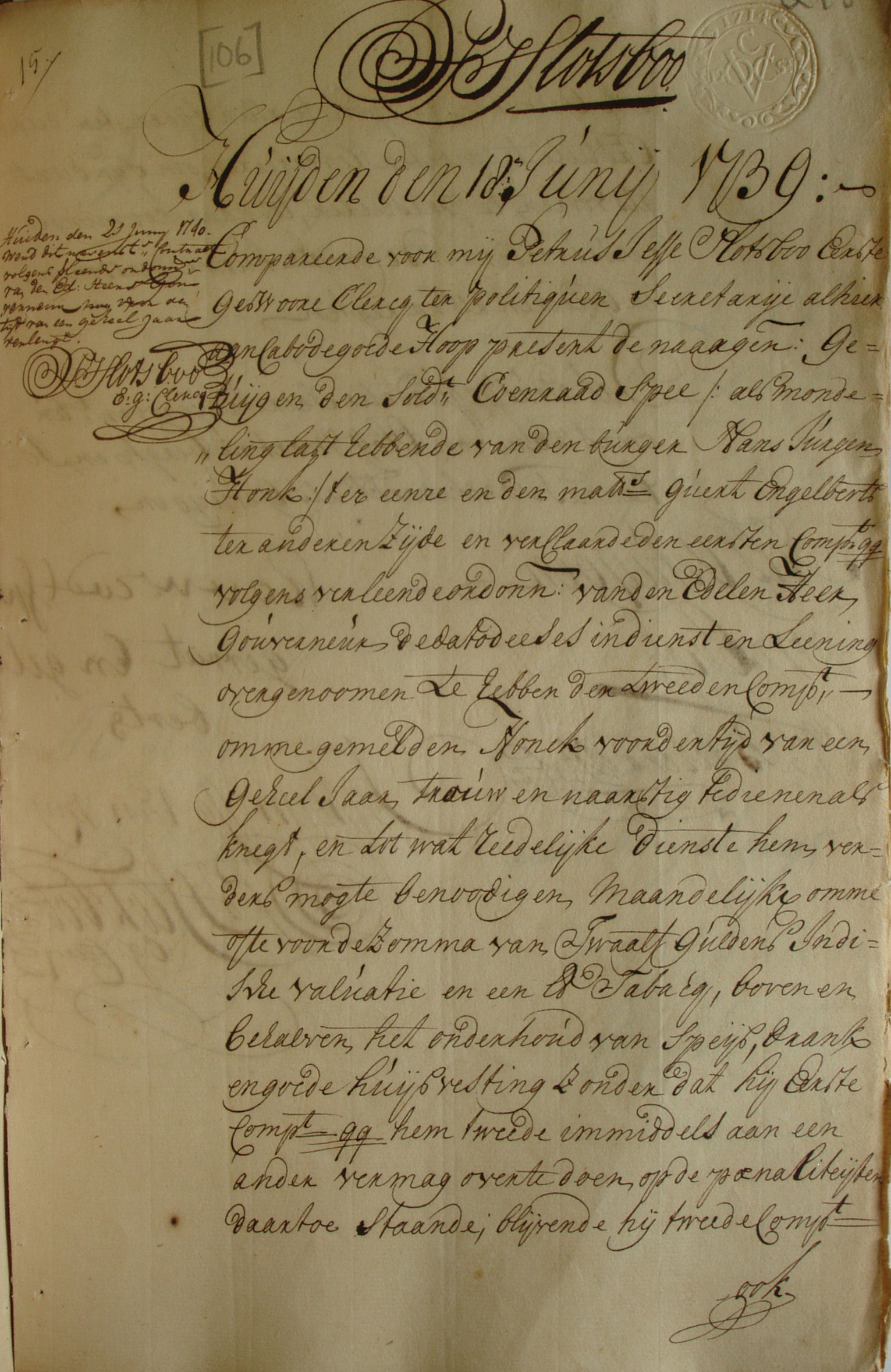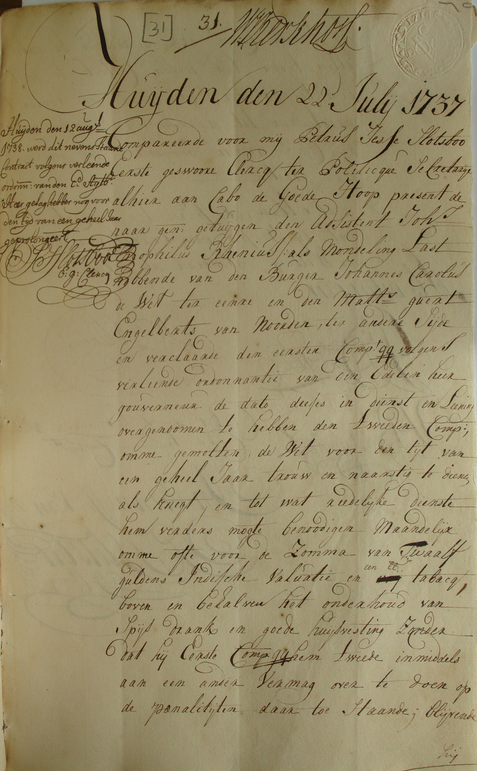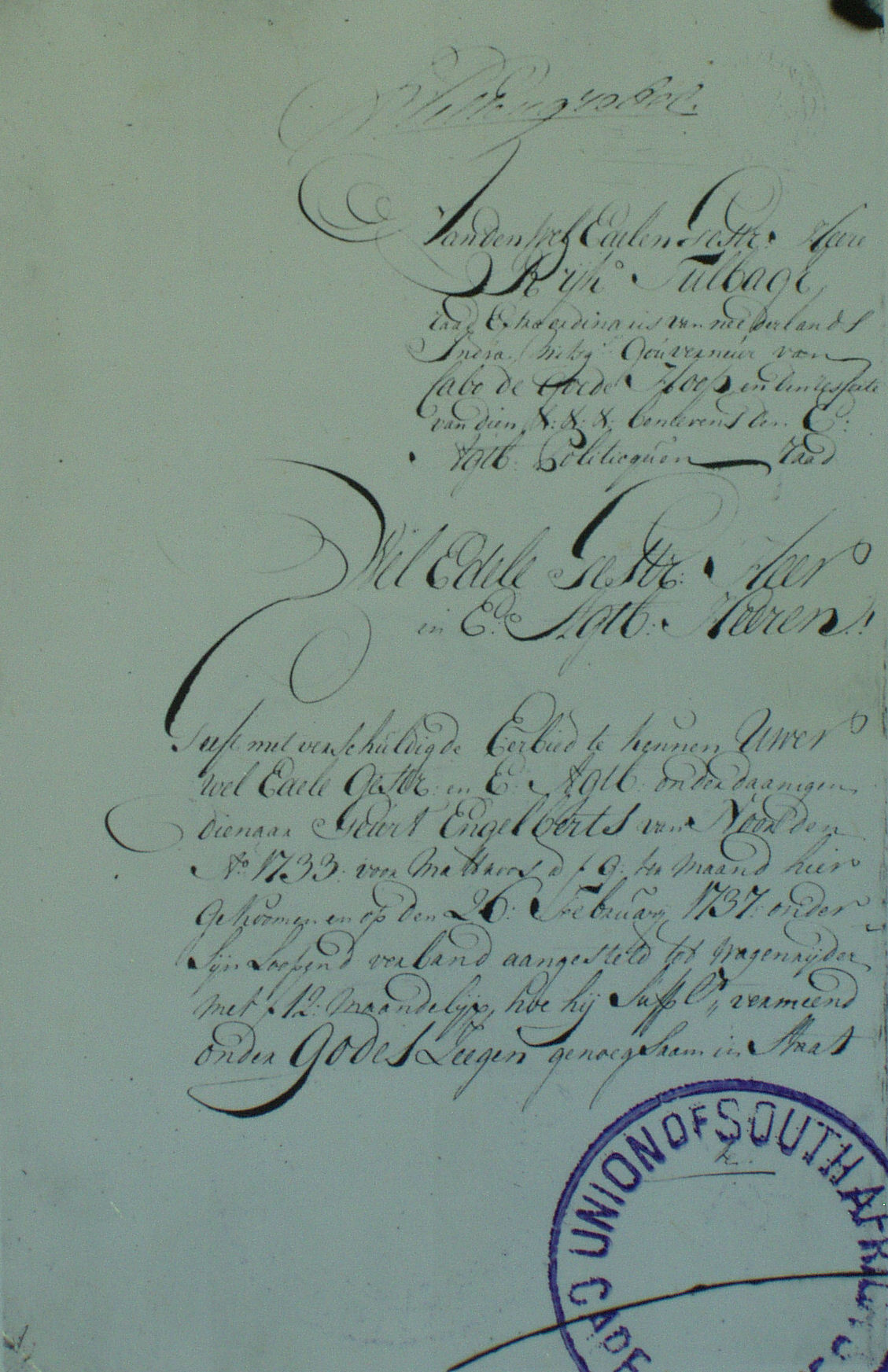 Geeft met verschuldigde Eerbied te kennen Uwer wel Edele gestr: en E: Agtb: onderdaanigen dienaar Geurt Engelberts van Noorden A0 1733 voor matroos @ fl 9 per maand hier gekoomen en op den 26 Februarij 1737 onder zijn loopend verband aangesteld tot wagenrijder met Riksdaalders 12 maandelijx, hoe hij Suppl. vermeend onder Godes Zeegen genoegsaam in staat te zijn, omme zig alhier, met desselfs ambagt van Huijs timmerman buijten den dienst der E: Comp. op een eerlijke en betaamlijke wijze te kunnen erneeren, derhalven neemt den suppl. de vrijheid zig te wenden tot Uwe Wel Edele Gestr: en E: Agtb: met needrig versoek dat het deselve behaagen mag hem uijt E. Comps dienst te ontslaan, en met het Burgerregt deeser plaatse te begunstigen.